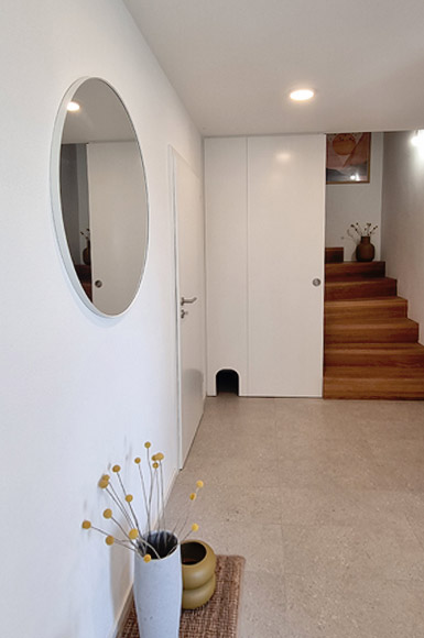 Der Hauseingang wurde verlegt, ein großes Fenster eingefügt und eine neue moderne Innentreppe mit Stauraum zeigt den Weg nach oben in den Wohnbereich. Nach dem Umbau ist der Eingangsbereich mit Garderobe größer und so wohltuend offen und freundlich, dass man sich an den ehemals dunklen und engen Eingangsflur kaum mehr erinnern kann.