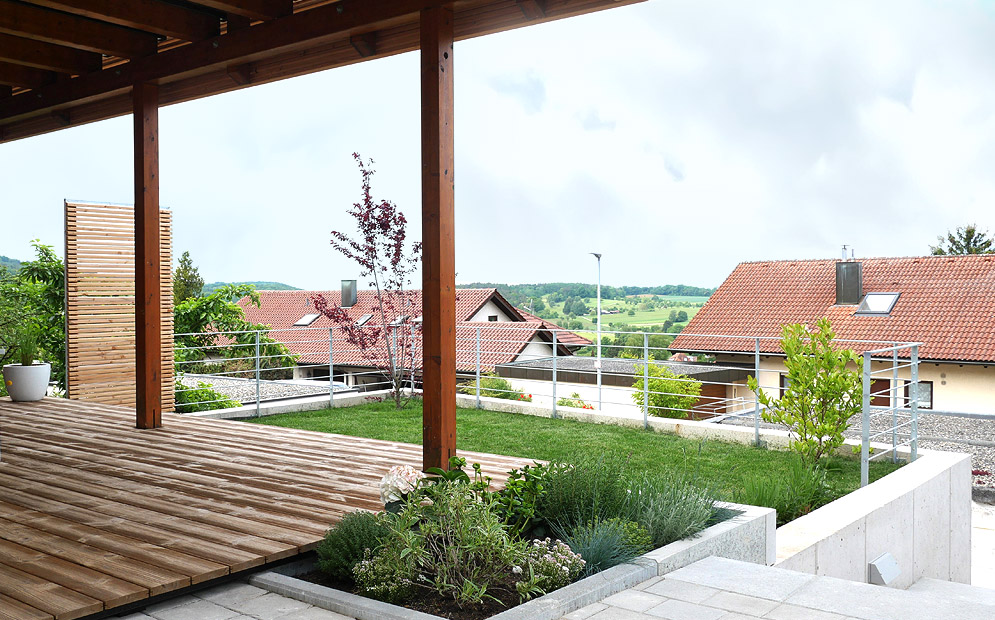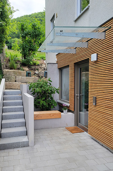 Von der Straße führt nun ein neu gestalteter Treppenaufgang den steilen Hang hinauf, frei und luftig, vorbei am neuen Holzdeck und einer kleinen, ebenen Gartenfläche, bis zum Vorbereich am Hauseingang mit Bank, Vordach und neuer Großzügigkeit. Verschnaufen, Ausblick genießen und dann: hereinspaziert und herzlich Willkommen.